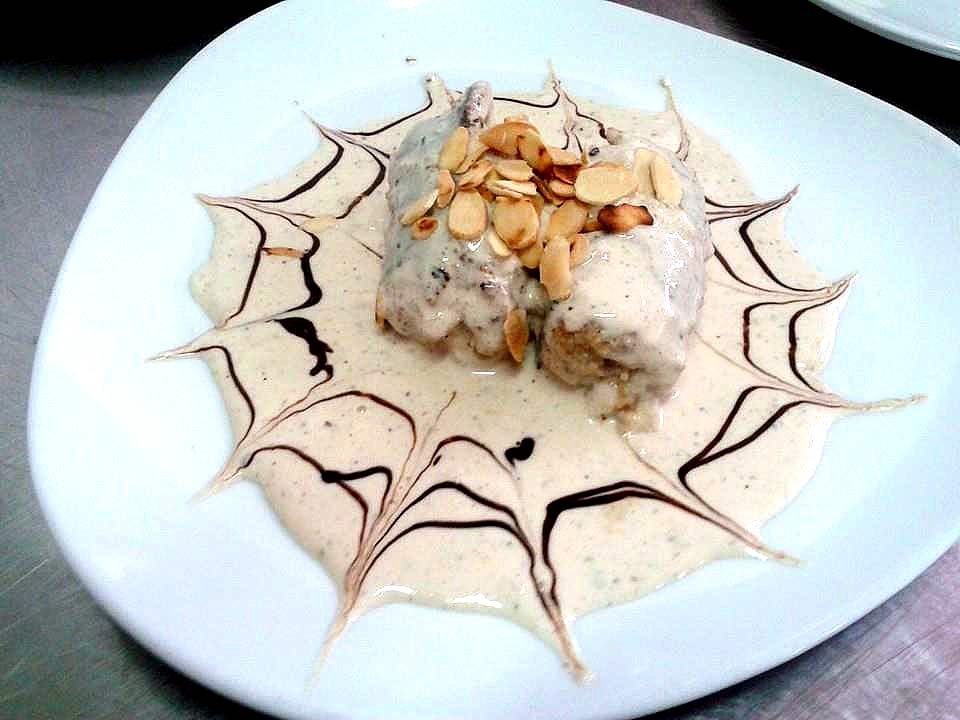 Involtini di Maialino farciti ai formaggi di Santo Stefano e croccanti mandorle agrigentine su fonduta di robiola di capra girgintana